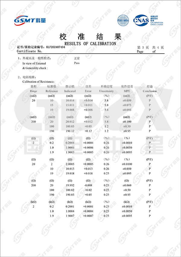 3. 分辨率:1μΩ(20mΩ檔);10μΩ(200mΩ檔);0.1mΩ(2Ω檔);1mΩ(20Ω檔);10mΩ(200Ω檔);0.1Ω(2000Ω檔) 。