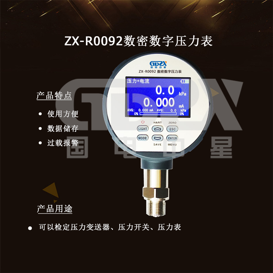 ZX-R0092數密數字壓力表非常適用于現場及實驗室使用,可與全自動壓力校驗臺連接,作為全自動壓力校驗臺的外置壓力模塊使用,也可與各種壓力源連接組成完善的壓力校準系統。通過標準 RS232聯機檢定,實現遠程控制、數據處理,打印檢定記錄及檢定證書。
