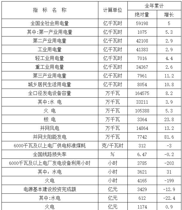 2017年中國電力運行現狀分析數據顯示,2016年,全社會用電量59198億千瓦時,同比增長5.0%。分產業看,第一產業用電量1075億千瓦時,同比增長5.3%;第二產業用電量42108億千瓦時,同比增長2.9%;第三產業用電量7961億千瓦時,同比增長11.2%;城鄉居民生活用電量8054億千瓦時,同比增長10.8%。