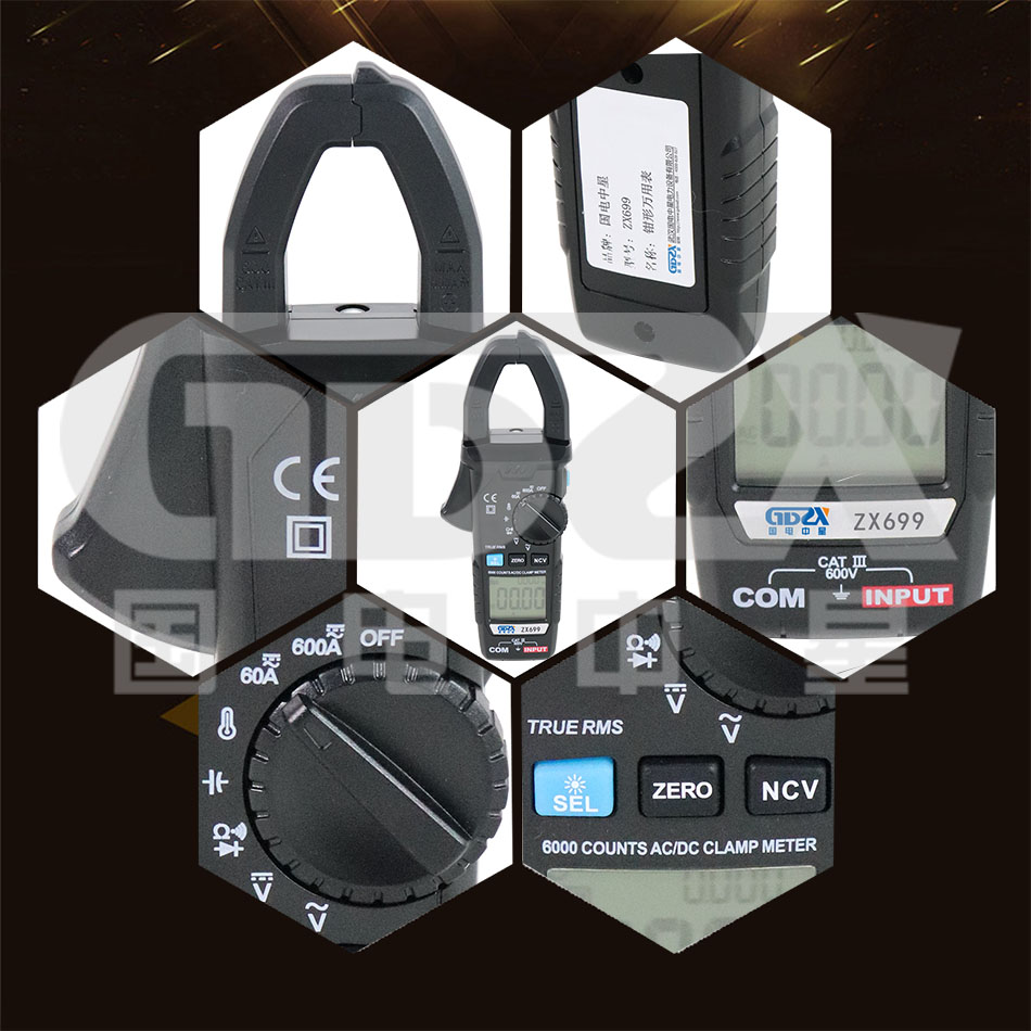 ZX699鉗形萬用表是一款6000計數,交直流自動量程鉗形表,具備數據保持、環境溫度測量、自動關機、背光源、手電筒、全量程過載保護及電池欠壓指示等。儀表可用于測量交直流電流、交直流電壓、電阻、電容、二極管、線路通斷、溫度、NCV非接觸交流電壓探測。無論專業人士、工廠、學校、儀表愛好者或家庭使用,均為一臺理想的多功能產品。
